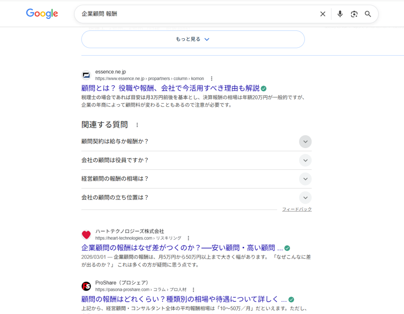 まずはこちらをご覧ください。 Googleで「企業顧問 報酬」と検索してみてください。
